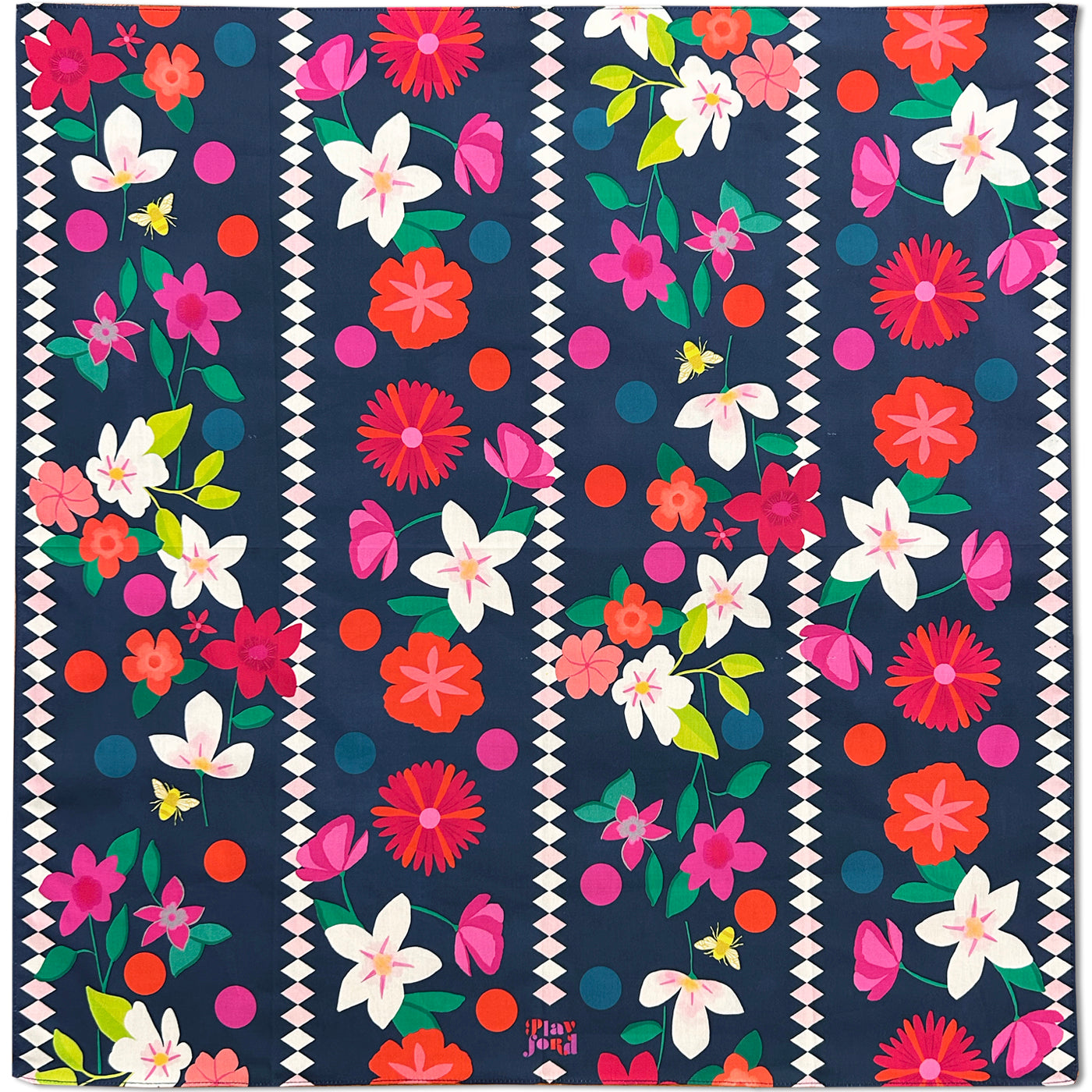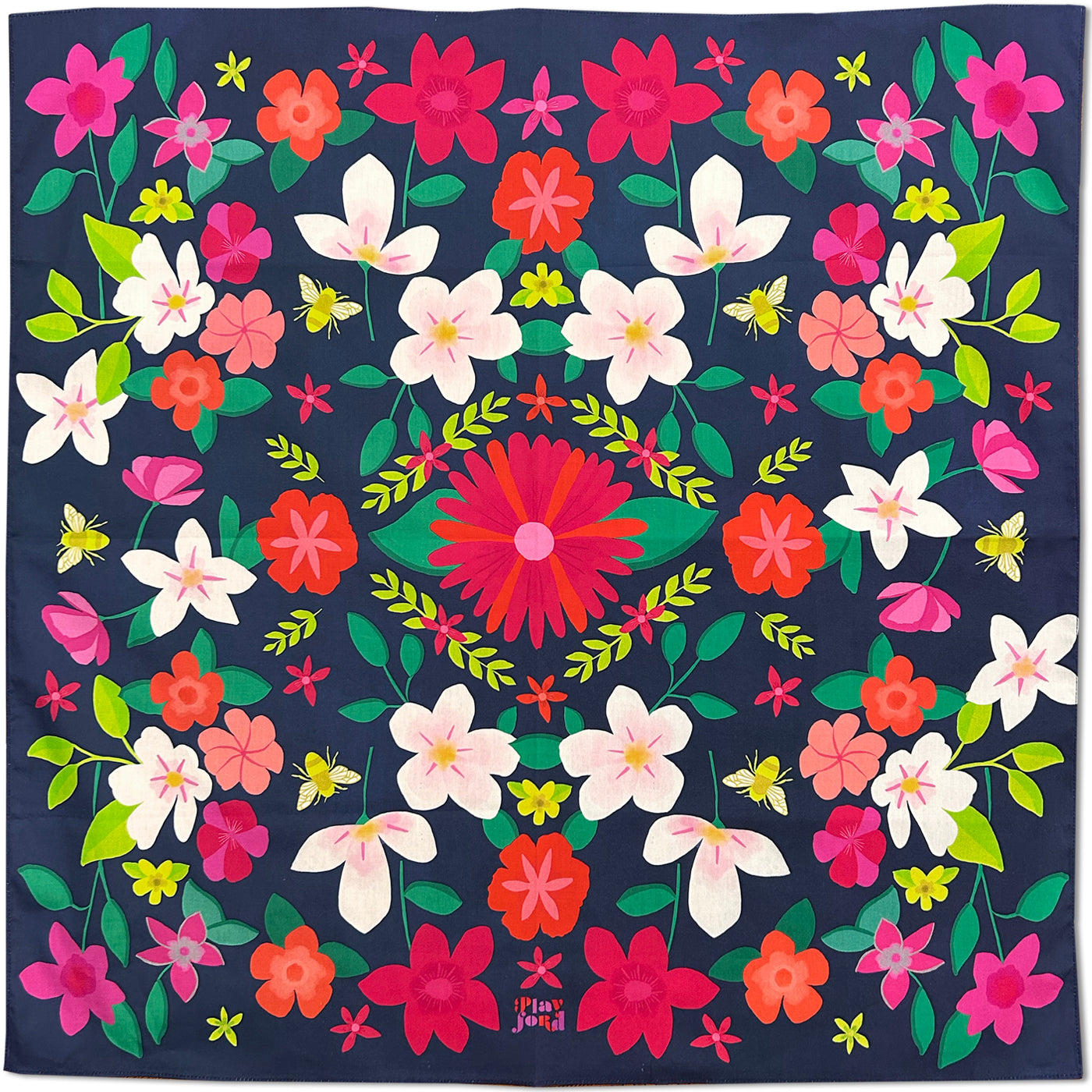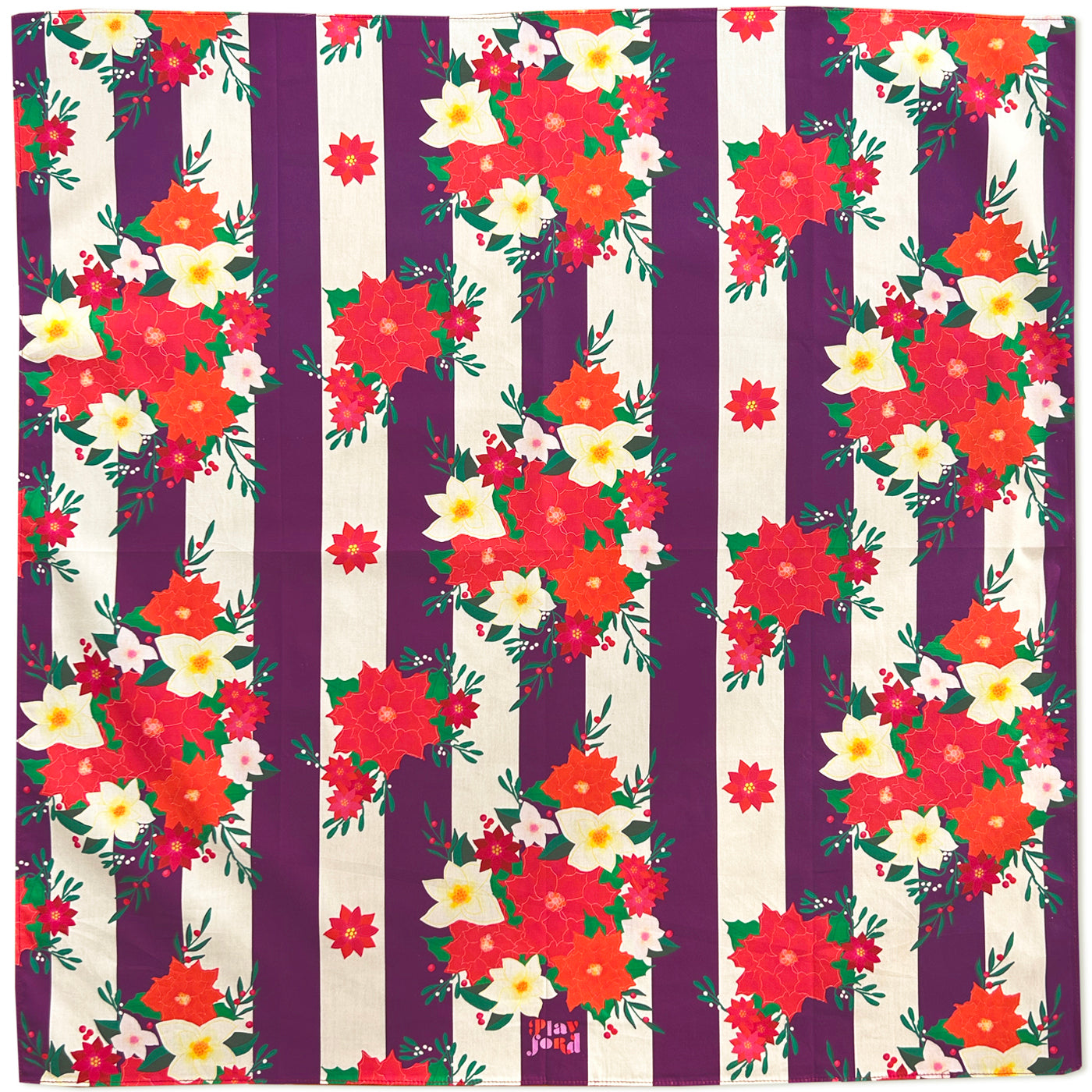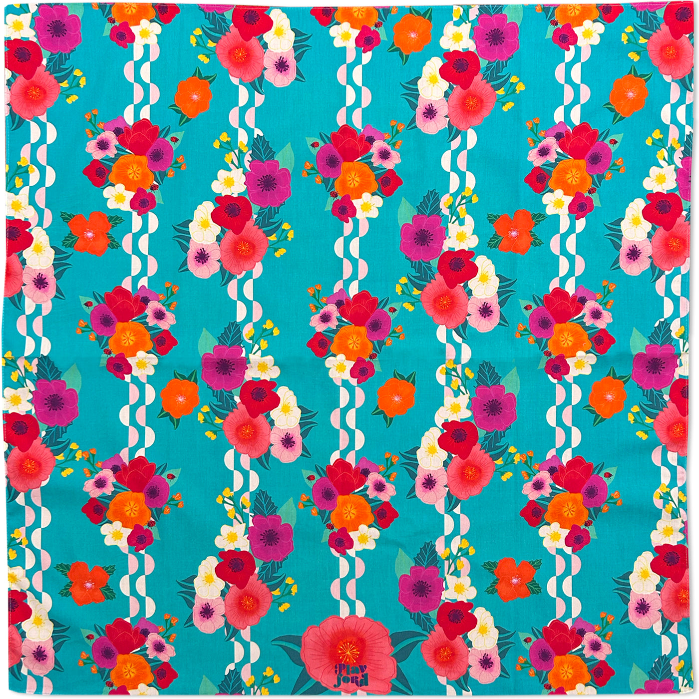 Playford Art Wraps are 27" X 27" square. Original art by Jennifer is digitally printed on 100% BCI Cotton (Better Cotton Initiative). Each wrap is stitched along the edge and carefully finished. Easy to use as gift wrap, the fabric is perfect for tying knots...it's not too thick or bulky and holds the shape of the bow. Machine washable on the cold setting, hang to dry and iron on the cotton setting. The colours do not run or fade. Jennifer gives extra thought to the corners in her designs as they are featured when used as gift wrap. Many of her designs have a bold element in the center which looks especially nice when used as tablecloths.